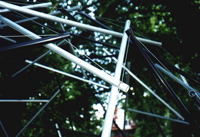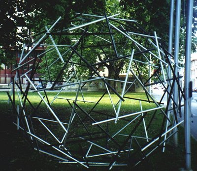 A large tensegrity geodesic structure outside the Buckminster Fuller Exhibition in Zurich summer of 1999.